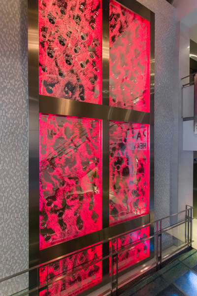 #138 Mur de bulles intérieur au format impressionnant de 20 pieds de hauteur avec contour fini stainless steel. Il est de type Dancing Fire et comporte un éclairage Del offrant un choix de plus de 256 couleurs. Ce très beau projet a été réalisé à St-Eustache au Canada.