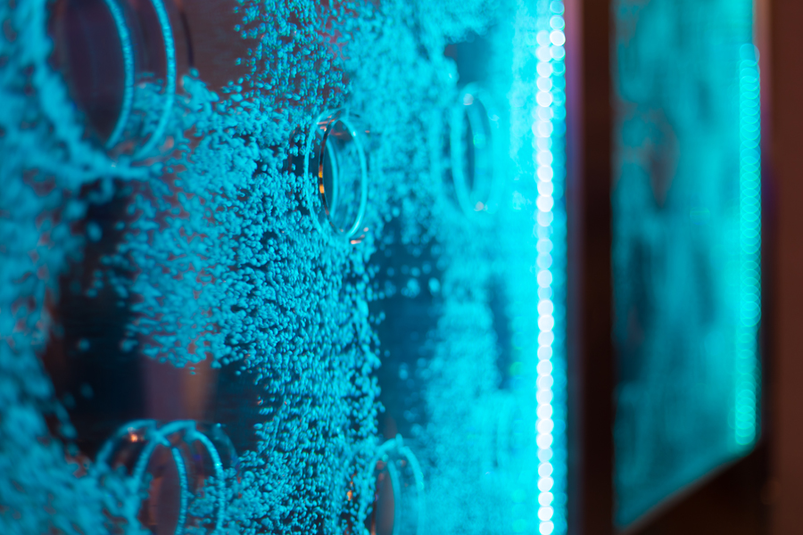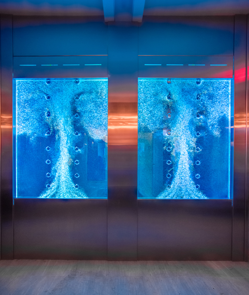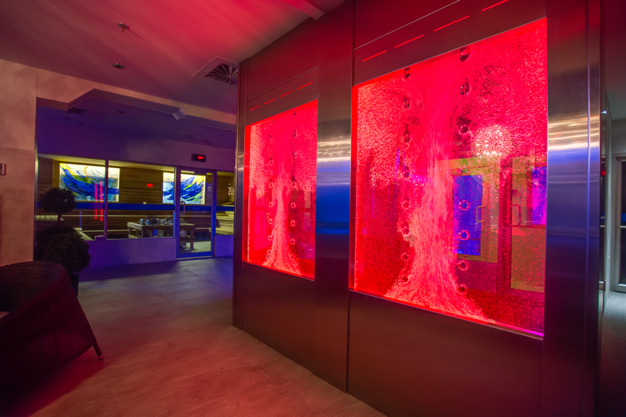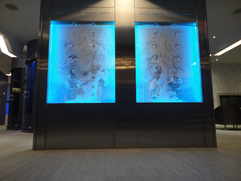 #561 Mur de bulles le volcan double utilisé comme impact central dans une pièce de style lounge. Cette installation est munie d'un système avec contrôle Del intégré pour offrir une lumière de couleur vive. Ce mur inclus aussi les micros bulles et l'effet dancing fire. Son contour est en stainless steel. Ce projet a été crée pour le Spa Mathers à St-Eustache.