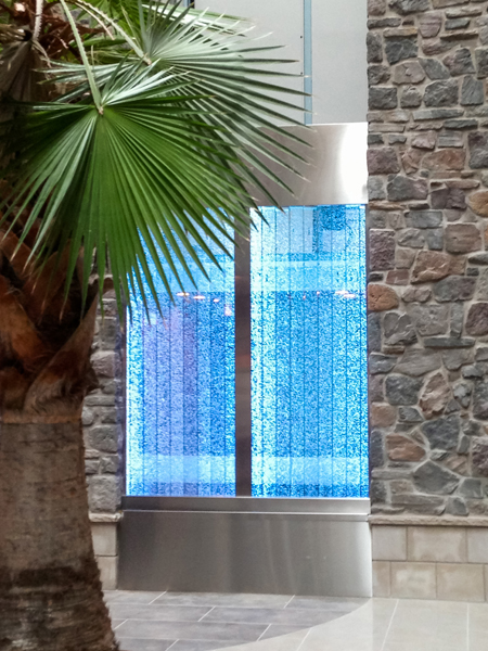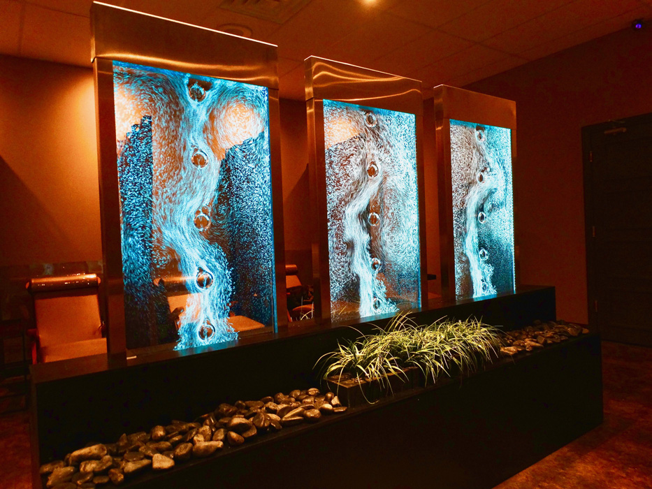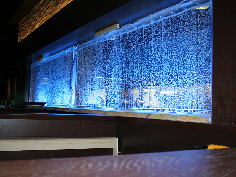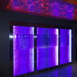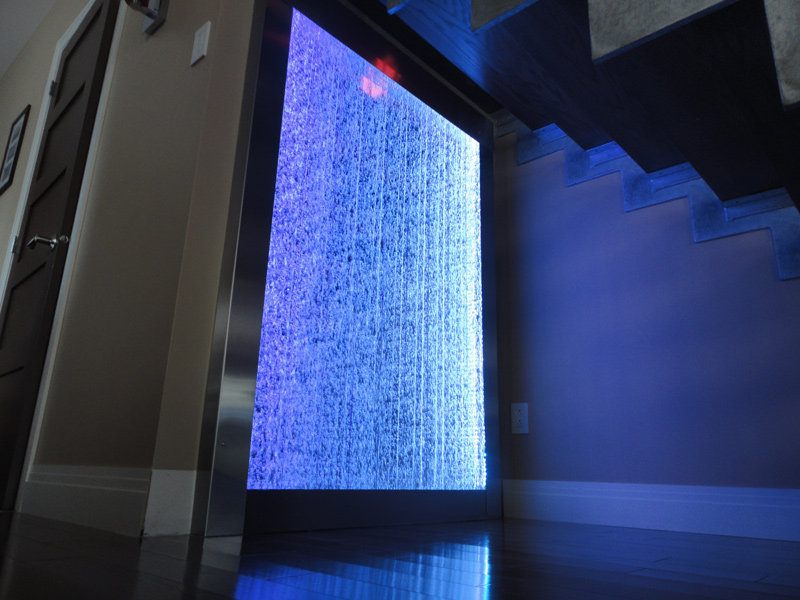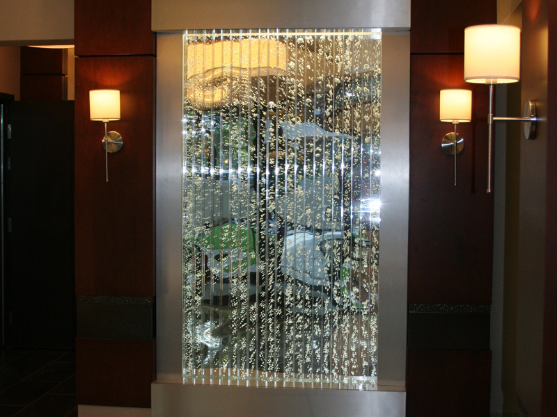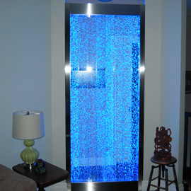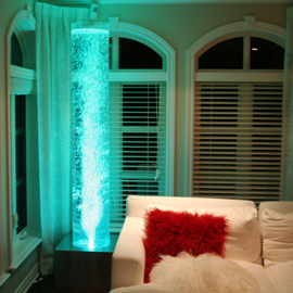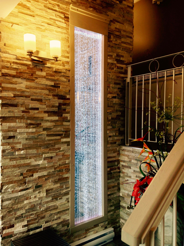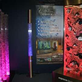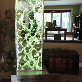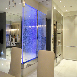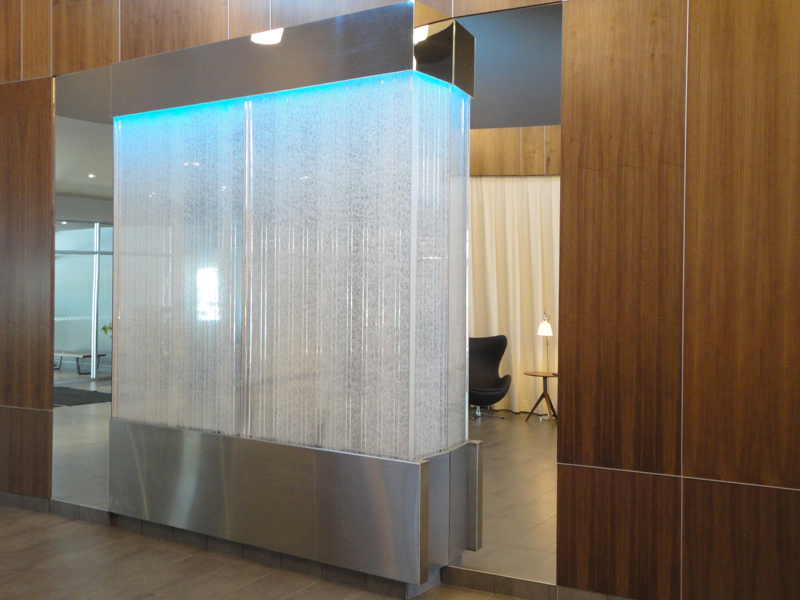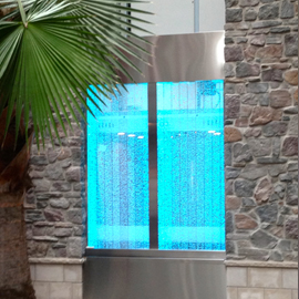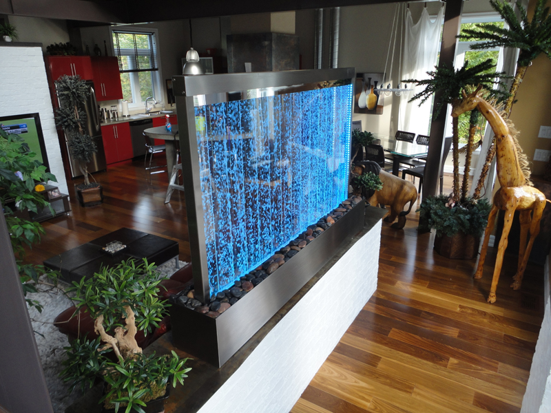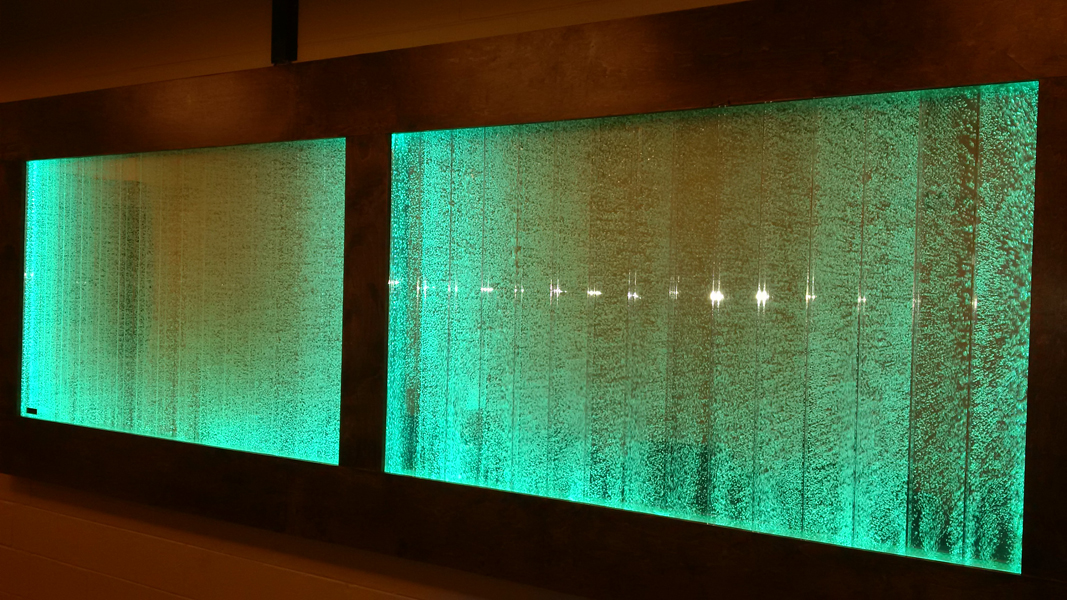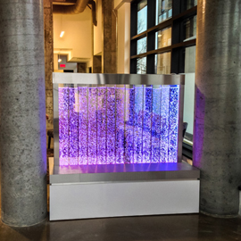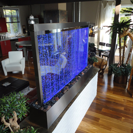 Les murs de bulles intérieurs ajoutent de la vie à vos espaces. Alternative aux cloisons traditionnelles, les murs de bulles étonnent toujours par leur mouvement et leurs couleurs variées. Puisque l'eau est un élément négatif et l'air, un élément positif, le mur d'eau agit en tant que filtreur naturel, attirant les poussières vers l'eau et nettoyant ainsi l'air, tout en gardant le taux d'humidité ambiante stable.