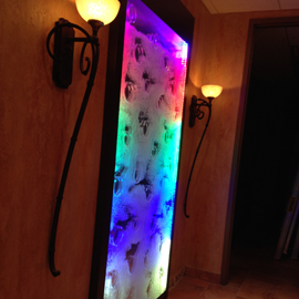 #548 Mur de bulles encastré, couleurs variées, cadre de bois foncé, dans un hall d'entrée.